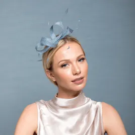 Stylowa i gustowna ozdoba na głowę w postaci wąskich zwojów materiału oraz ręcznie przycinanych piórek w małe strzałki. Lekkie piórka powiewają dodając delikatności. Całość w kolorze ciekawego, szaro-niebieskiego koloru. Taki fascynator pięknie podkreśli wizytowy strój i odmieni najprostszą fryzurę zrobioną w domu.