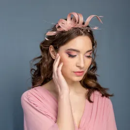 Delikatny ale też nieco ekstrawagancki fascynator do włosów w odcieniu beżowego różu. To materiał ukochany przez światowe modystki. Ozdobiony jest naturalnymi piórkami- strzałkami i elementami woalki. Idealny dodatek na przyjęcie weselne, komunijne czy chrzest.