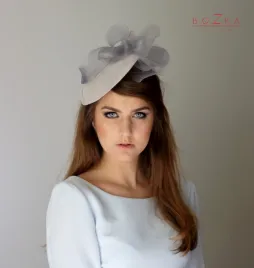 Kapelusz koktailowy - okazały fascynator w formie satelity jest w całości ręcznie szyty i formowany. Zdobią go zwoje artystycznie upiętej krynoliny. Szykowny dodatek na przyjęcie. Mocowany za pomocą cienkiej, srebrnej i metalowej opaski.