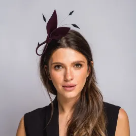 Bordo elegancki fascynator z ozdobnymi piórkami