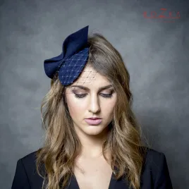 Filcowy dodatek na głowę w pięknym granatowym odcieniu. Okrągła baza - mini toczek zdobiona jest kokardą. Woalka natomiast stanowi tylko delikatny akcent na tej nowoczesnej ozdobie.