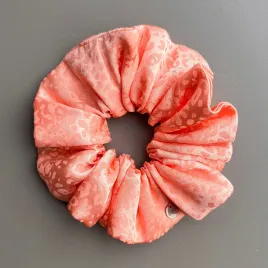 Scrunchie w soczystym łososiowym kolorze doskonale trzyma włosy i zdobi.