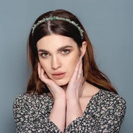 Delikatna ręcznie wyplatana opaska z zielonych nefrytów to subtelny dodatek do fryzury, biżuteria do włosów.