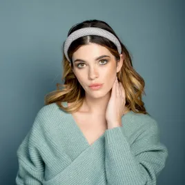 Minimalistyczna opaska w pudrowo- szarą kratkę.