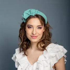 Gruba opaska do włosów obszyta bawełnianą popeliną. Uroczy wzór w zieloną krateczkę vichy uzupełni wiele letnich stylizacji. Jest ręcznie wykańczana i zdobiona nieregularną kokardą. Dodaje objętości fryzurze. W całości szyta w Polsce.