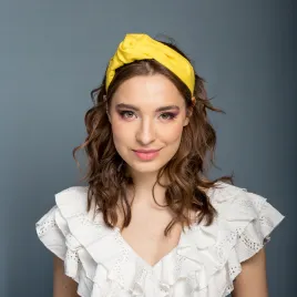 Sztywna opaska do włosów uszyta z bawełny w klasycznym żółtym kolorze. Posiada supeł z boku dla wielbicielek asymetrii. Dodatek do noszenia do prostych zwyczajnych outfitów, jak i na większe wyjście. Szalenie wygodna w noszeniu z możliwością regulacji wielkości i kształtu poprzez wyginanie.