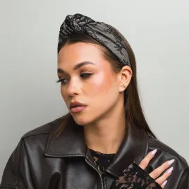 Czarna szeroka opaska z supłem z koronki.