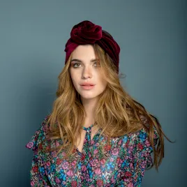 Burgundowa ciepła opaska damska z aksamitu.