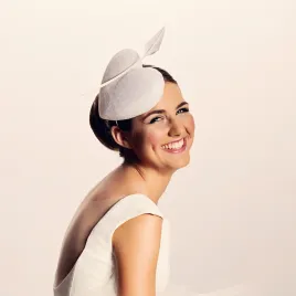 Piękny, biały toczek w kształcie serca wykonany został z polskiego wełnianego filcu. Posiada delikatne zdobienie w postaci jednego, białego piórka, które nadaje całemu toczkowi lekkości i delikatności. W całości został ręcznie formowany oraz szyty. Ciekawy i oryginalny akcent zarówno na ślubie jak i wieczorowej stylizacji.